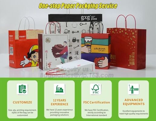 Su aspecto rígido permite para un concepto de los bolsos de cualquier forma, cualquier grueso y cualquier clase de productos. De los bolsos de la botella a los bolsos de los zapatos a los bolsos de Kraft para las frutas y verduras, nuestras bolsas de papel serán adaptadas a su demanda.